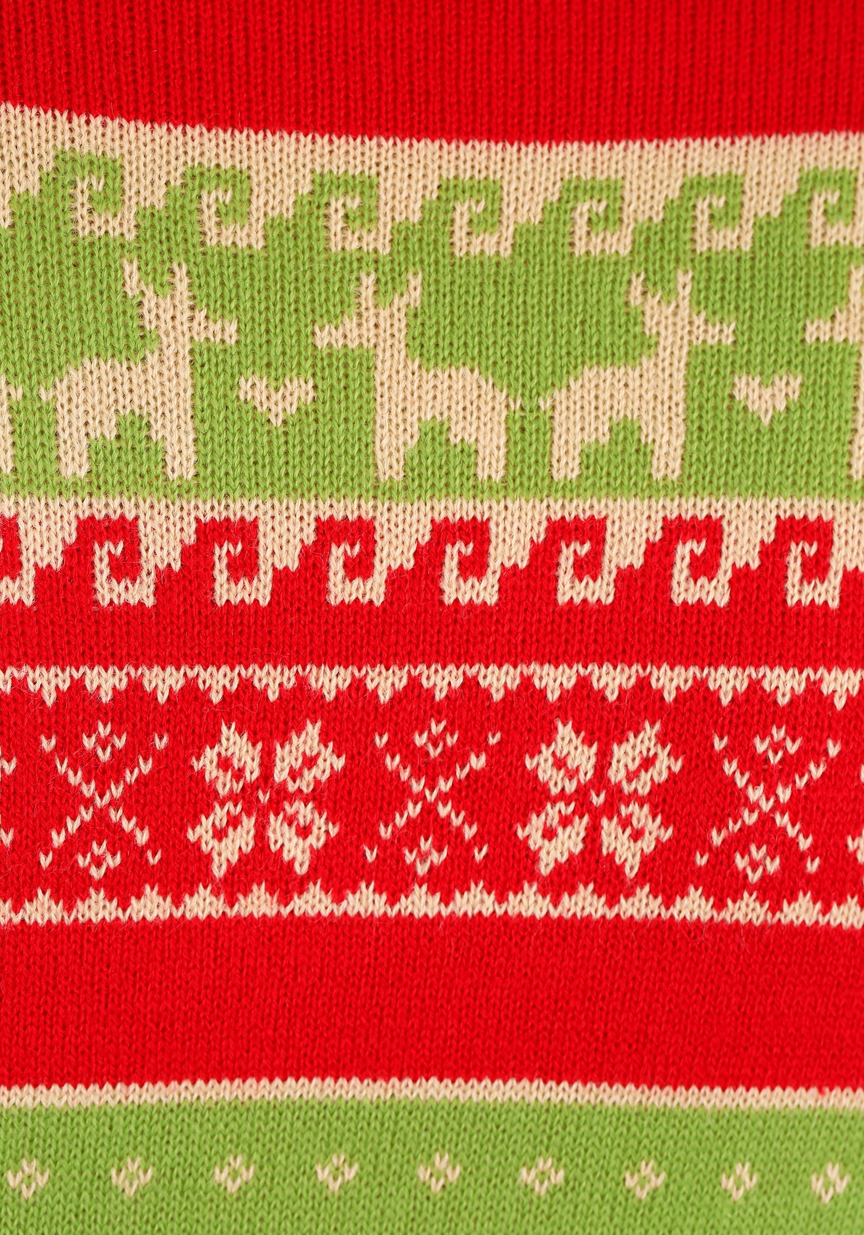 Get cozy this winter when you wear this Christmas Llama Ugly Sweater. Made from acrylic, it'll keep you warm as you deck the halls with boughs of holly. The knit-in design features one happy little llama and he's carrying some gifts on his back. It comes in a vivid green and red color scheme to help you feel festive! It'll be your instant favorite choice for the next ugly sweater party!