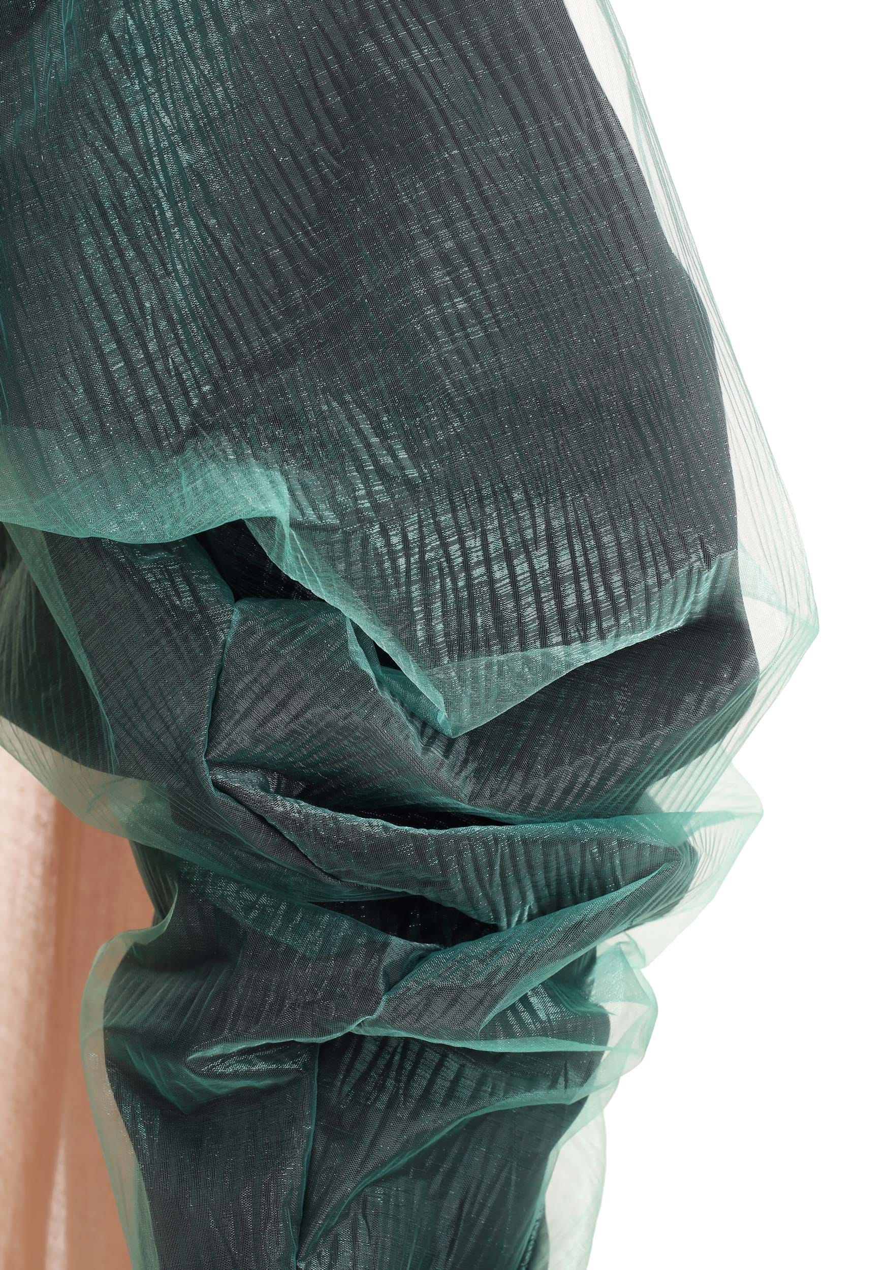 - Pants have elastic waistband, billowy organza overlay