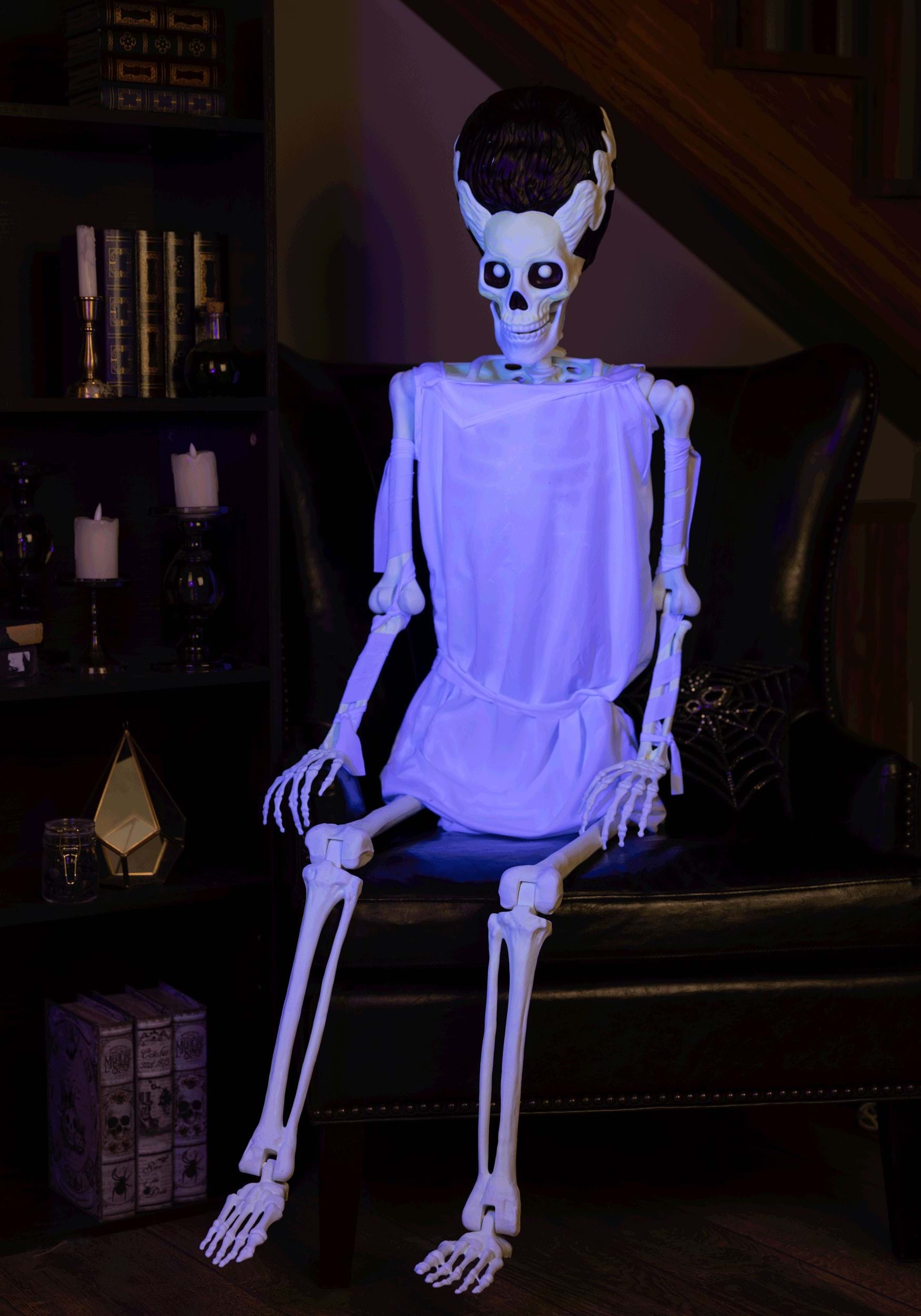 Standing (well, hanging) at a full 5.4 feet tall, this skeletal specter features posable joints, a molded plastic frame, and a ghostly white dress with a tied waist for that bridal-afterlife chic. Her iconic shockwave hairstyle is sculpted right into the skull, so there’s no mistaking who walked down the aisle—straight into the land of the undead.