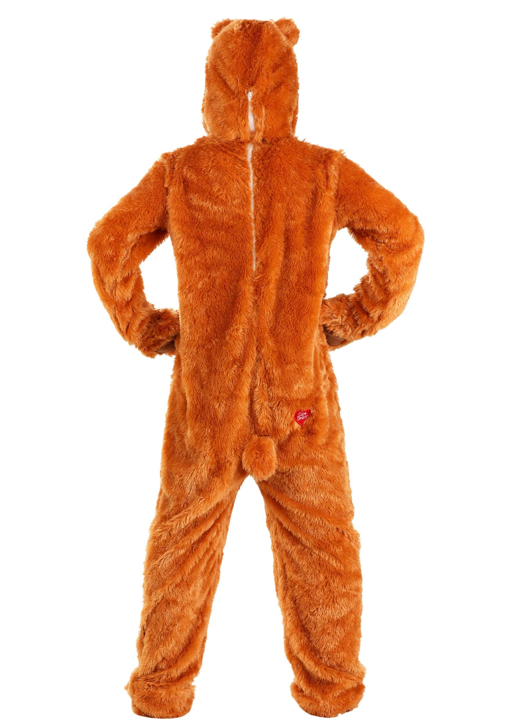 The exclusive Made by Us Care Bears costume for adults has a full-length zipper in the front as well as an appliques heart belly badge (Just like Tenderheart's!). There's an attached character hood with an embroidered face and two heart-appliqued mitts that are sewn directly to sleeve cuffs so you won't lose them. This feature also offers easy-access to both hands which is amazing since hands are important for doing just about everything. Finally, included shoe covers complete the head-to-toe disguise so we completely embody the "face" of the entire franchise, Tenderheart.