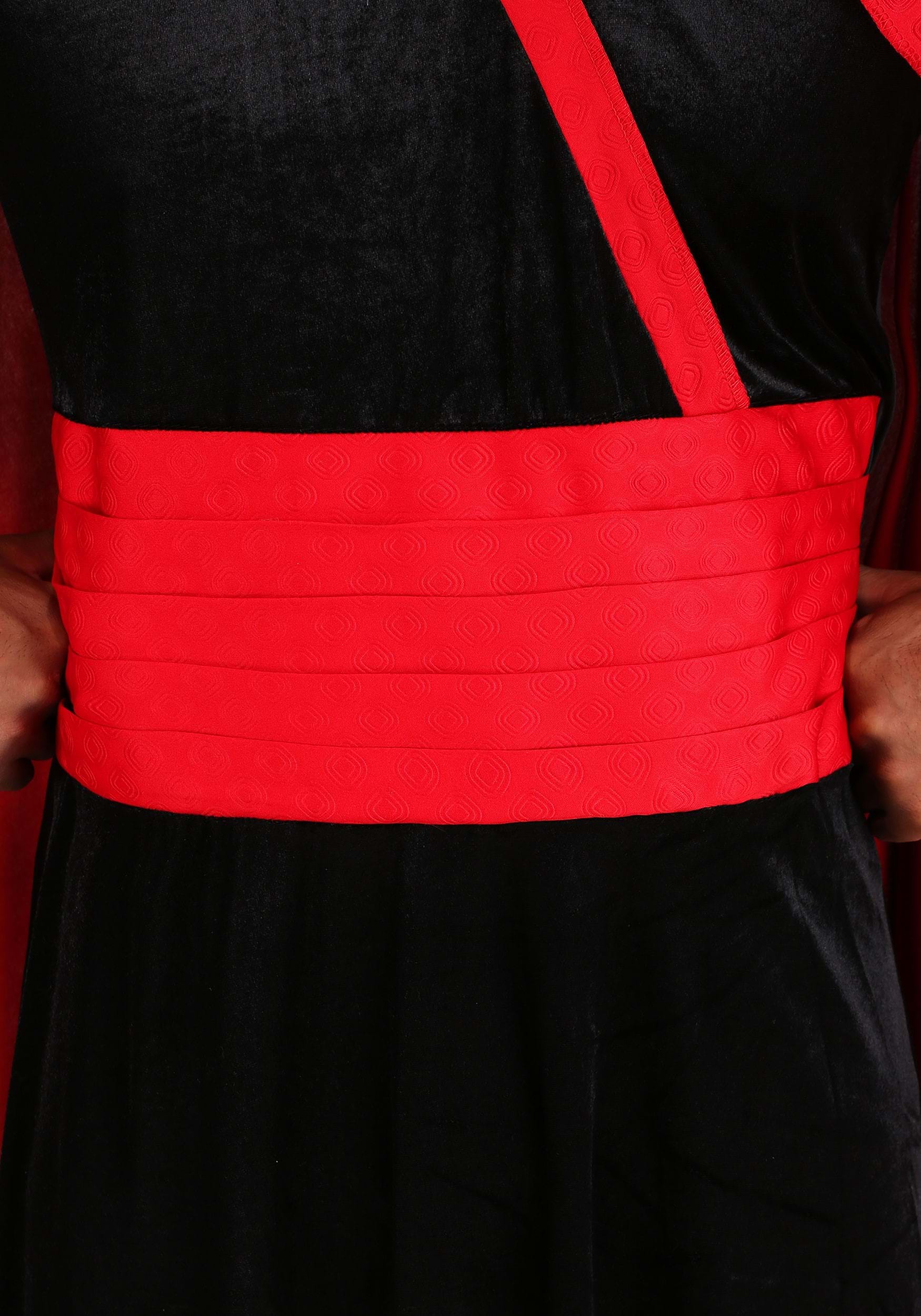 The robe is made from rich black polyester with a soft velvety finish and features a mock-wrap front and a wide pleated cummerbund sewn in at the waist. Structured shoulders and puffed sleeves add plenty of drama, while fitted cuffs keep it practical for actual movement (or, say, throwing open large double doors). A detachable cape fastens with hook and loop closures at the shoulders and back of the neck and includes a peaked foam collar to really sell the “trusted advisor with a secret plan” vibe.