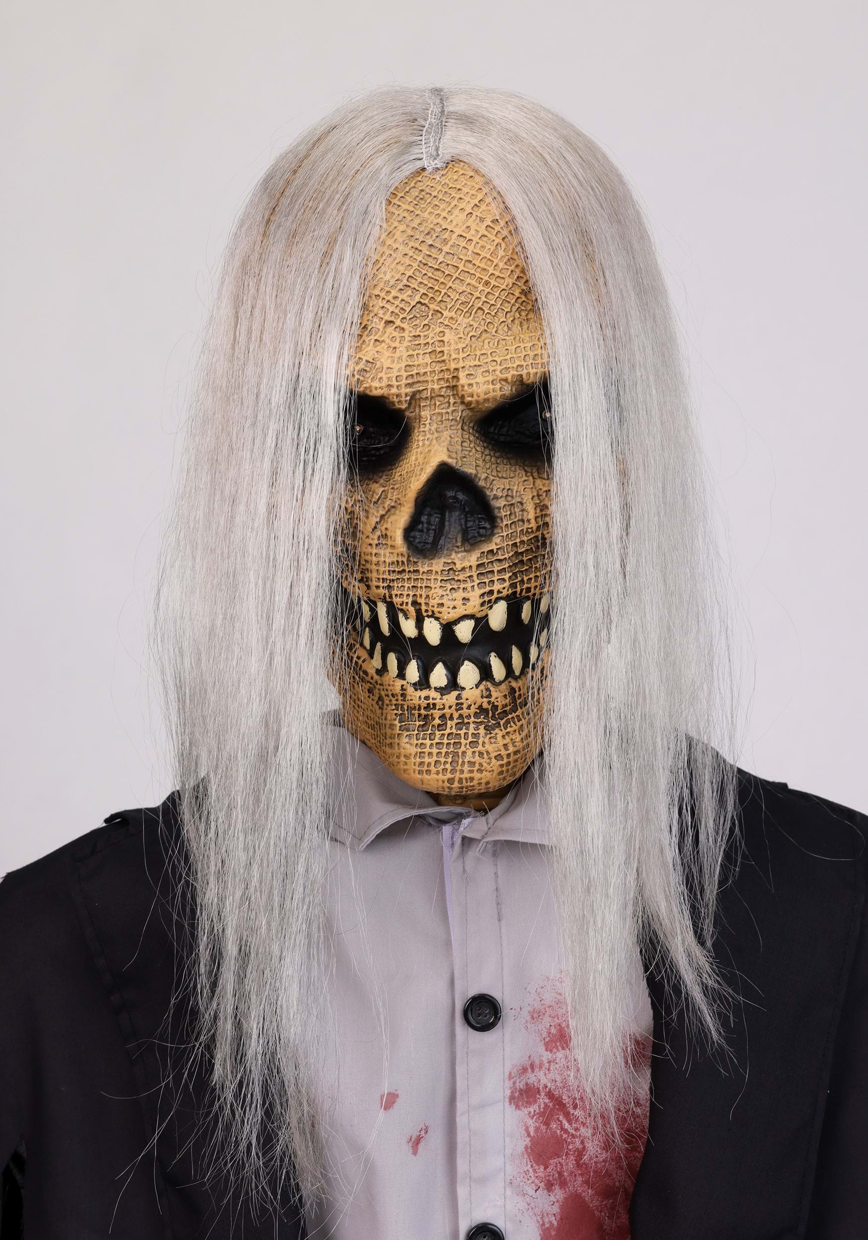 Gutfried arrives as a fully assembled 58-inch seated figure constructed from metal, plastic, and polyester fabric clothing. Long ratty hair drapes over his skeletal face, and weathered clothing completes the look of someone who's had a rough century or two. His right arm swipes outward while he clutches a candy bowl that lights up red along with his eyes, creating an eerie glow that's visible from the street.