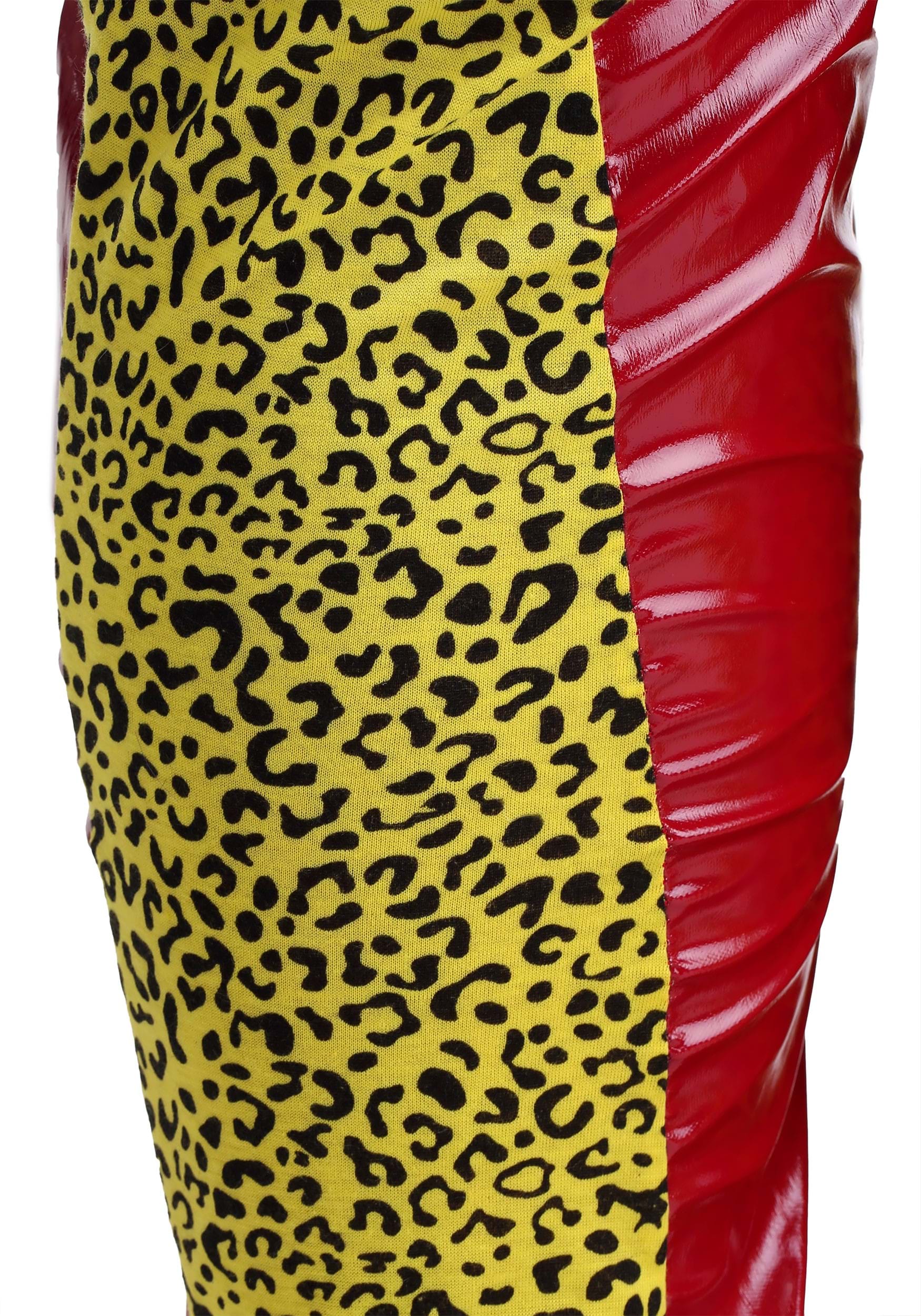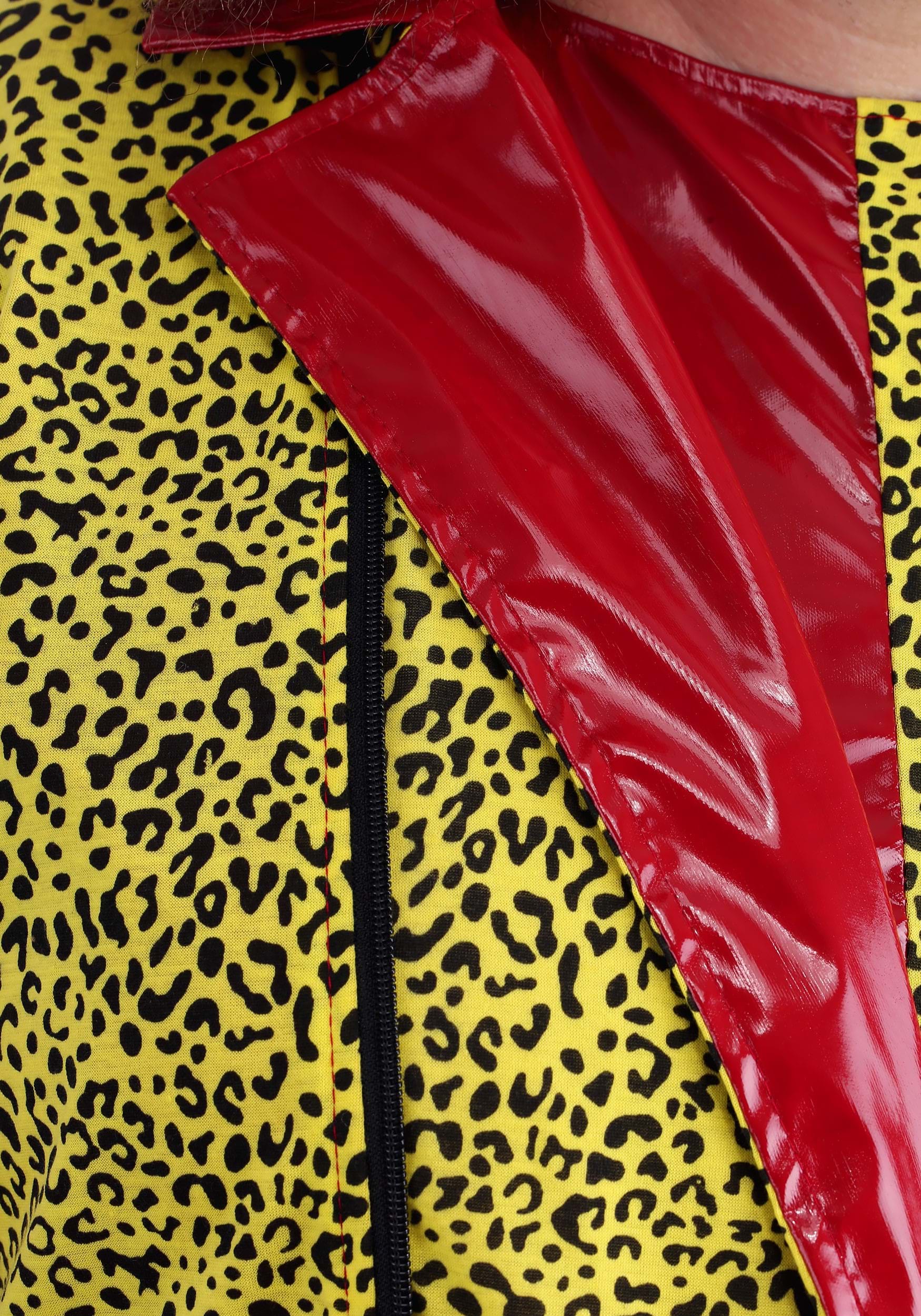 When you're rising to the top, you need an outfit that's going to announce your arrival as soon as you enter the room. This bright, show-stopping costume includes a sleeveless shirt that is fifty percent faux leather and fifty percent leopard print.