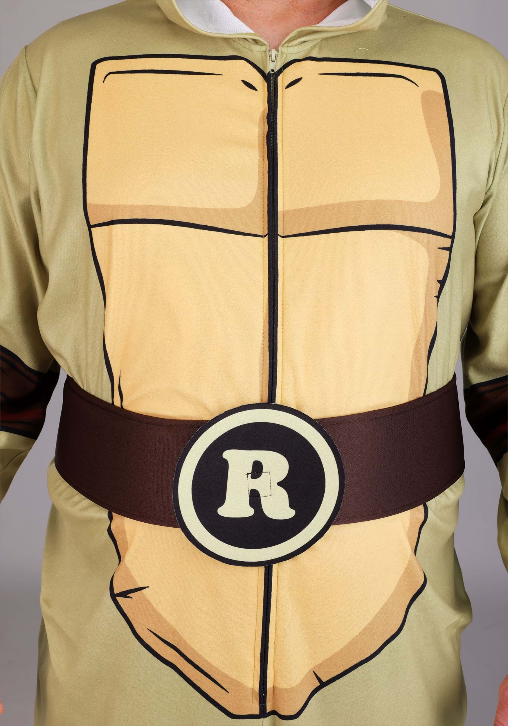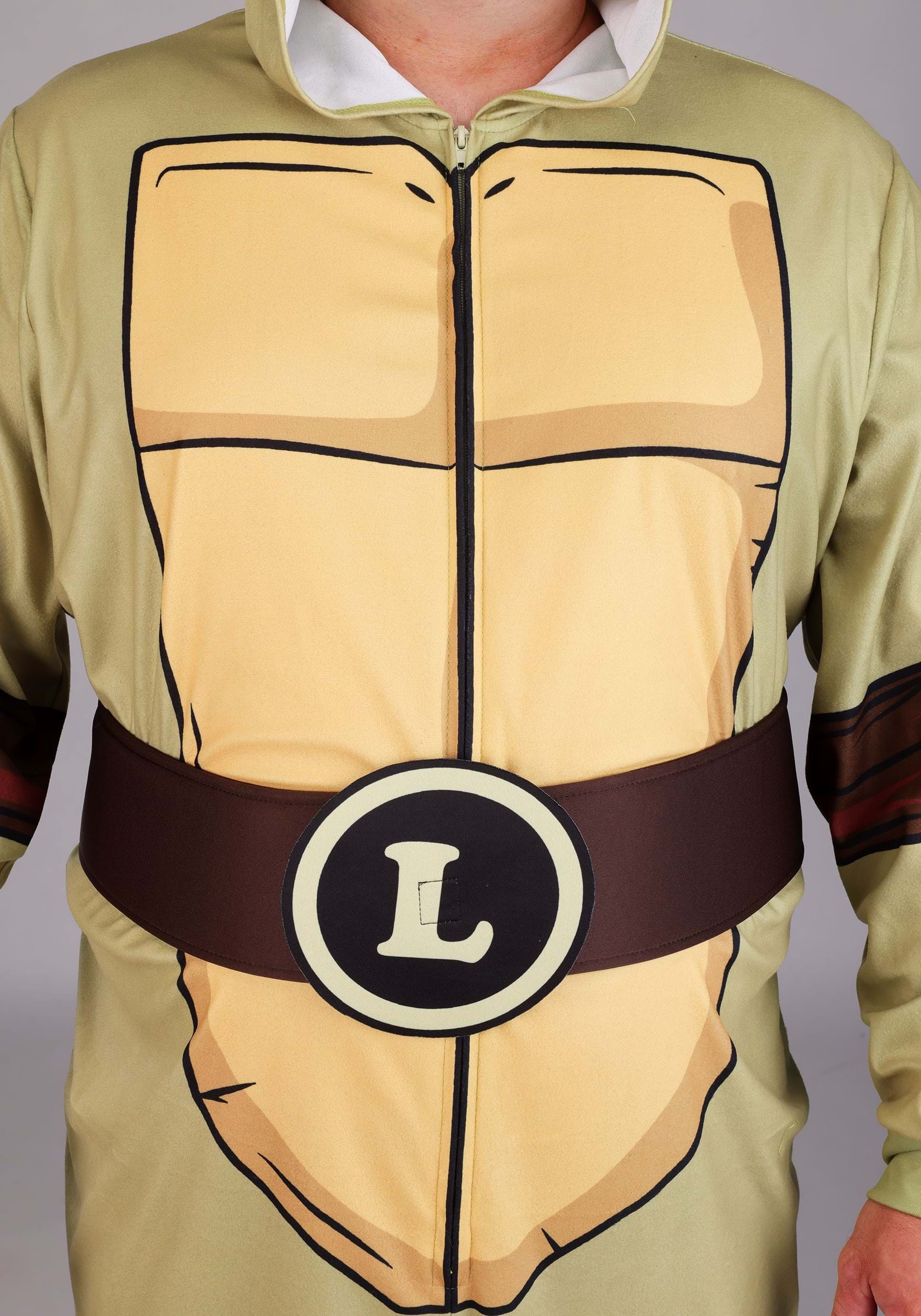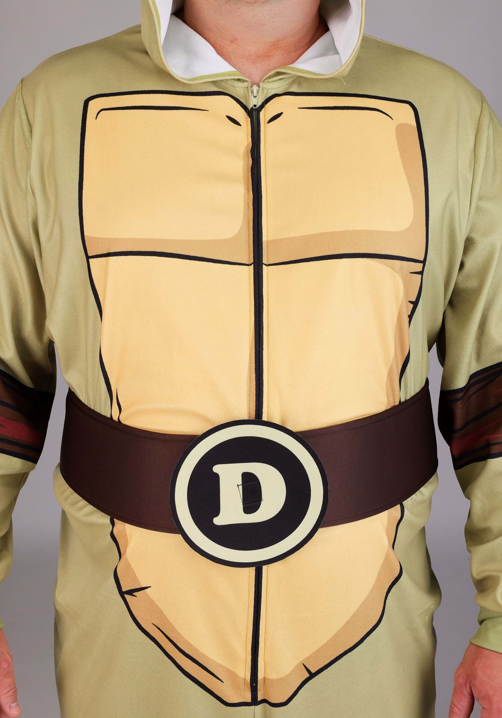 This officially licensed jumpsuit zips up the front and is made from soft fabric that’s easy to wear for extended turtle missions—or extended couch lounging. The front features a printed turtle shell design with elbow and knee pads printed directly onto the suit in deep brown. An attached brown belt sits at the waist with removable emblem patches for each turtle—M, R, L, and D—so your identity is always flexible.