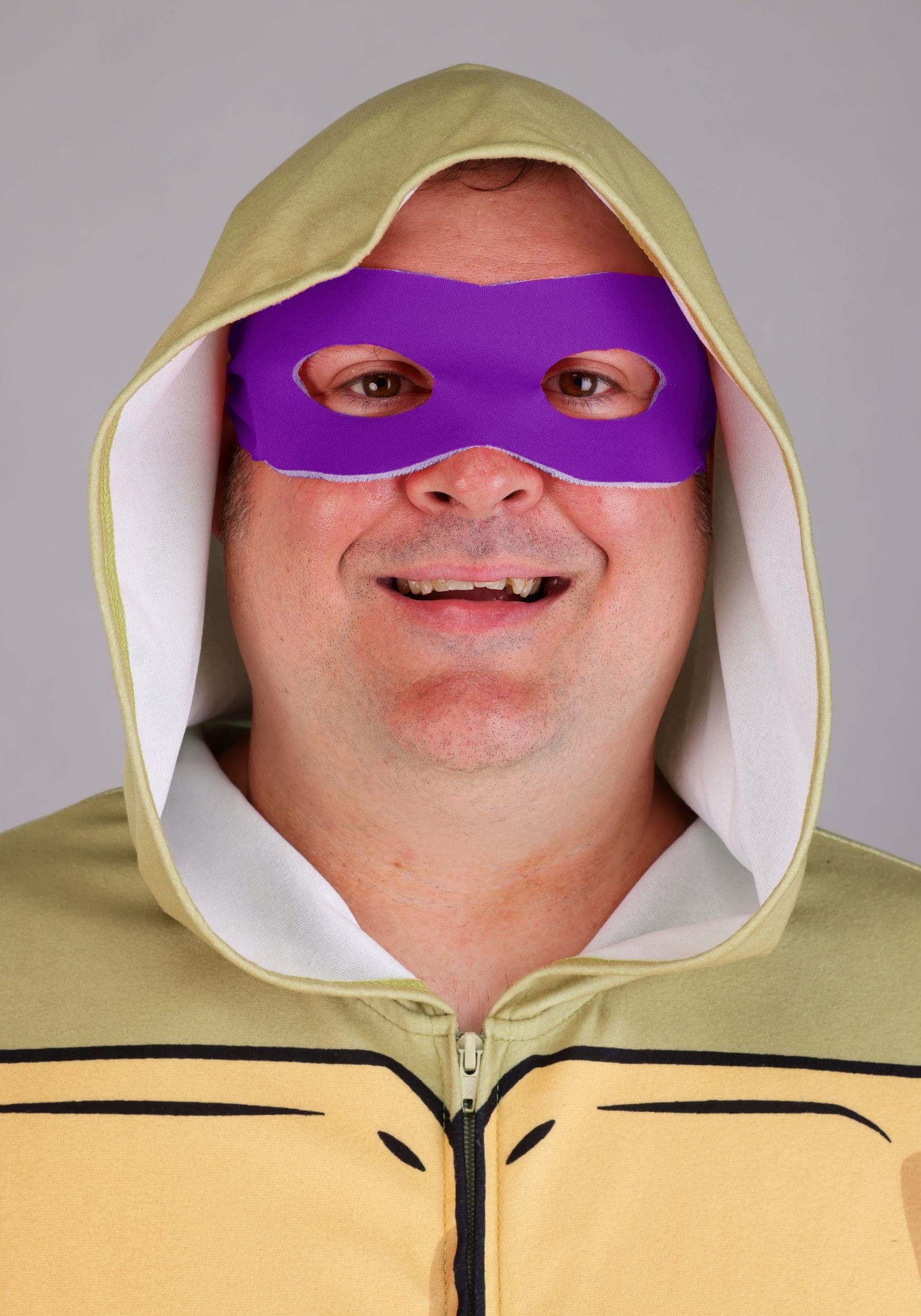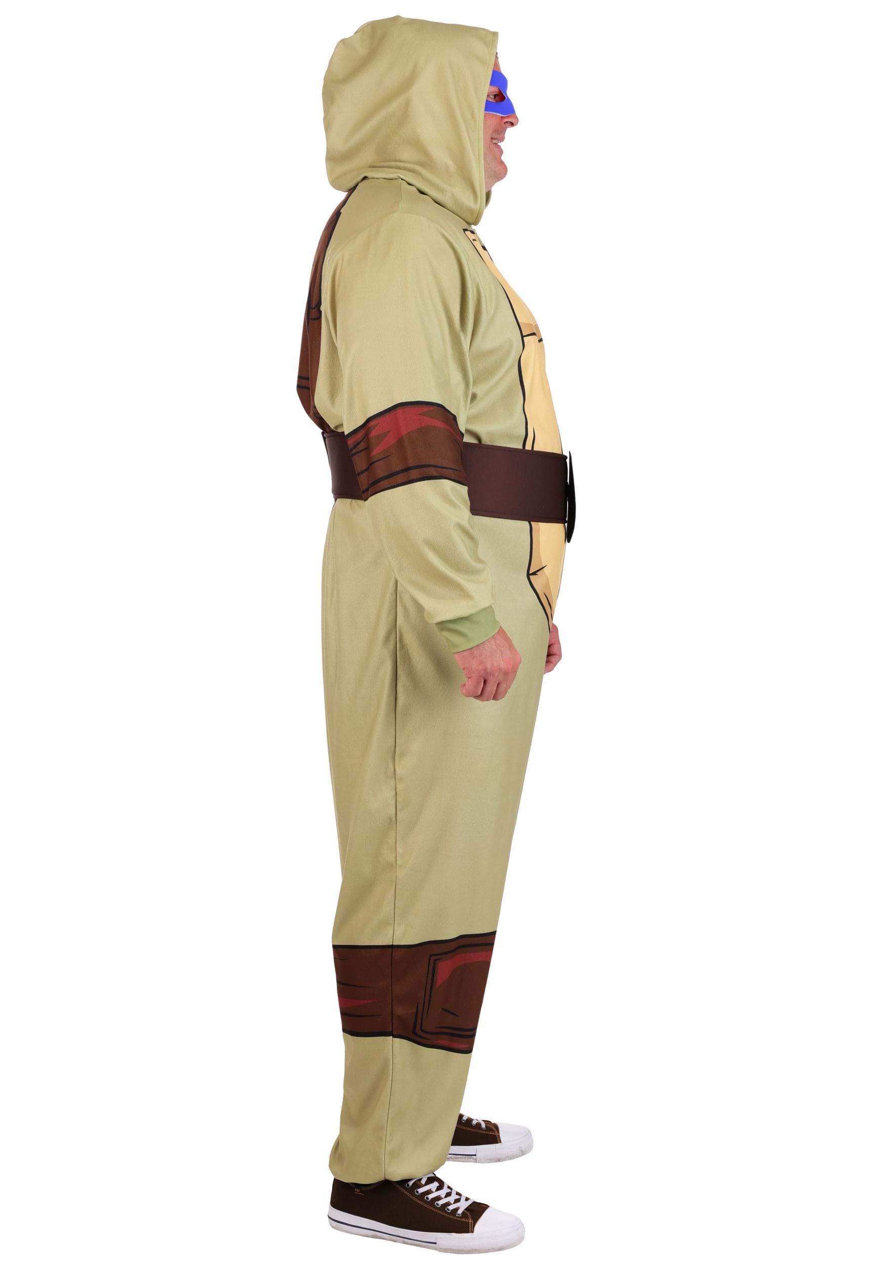 The attached hood adds instant turtle transformation with a smooth fit over your head, and you’ll find four separate eye masks (in orange, red, blue, and purple) to complete the look. Just pick your color, tie it on, and go full sewer squad. The overall fit is relaxed and built with plus size proportions in mind, so it moves comfortably from party mode to pizza mode with no shell-cracking required.