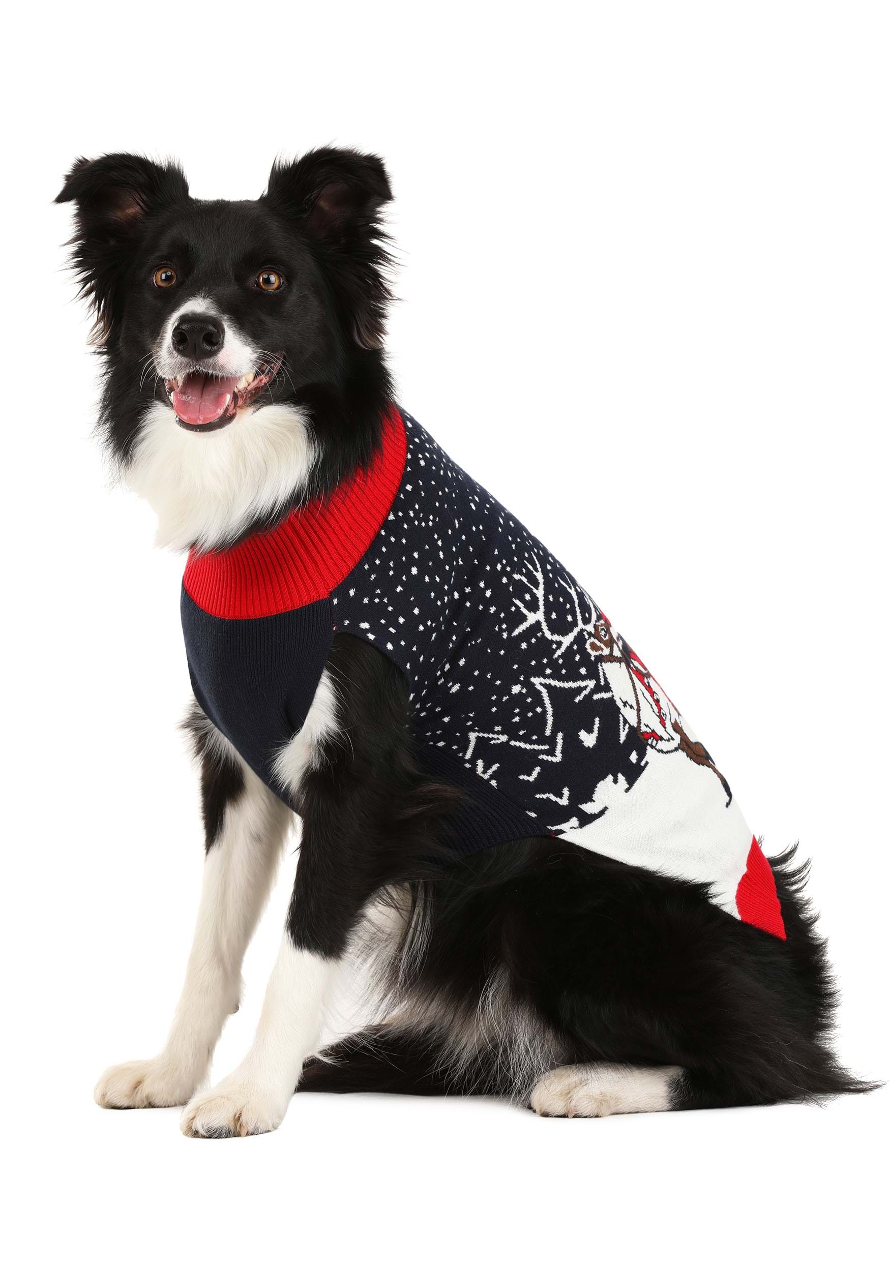When the weather outside is frightful, dress your favorite pup in this exclusive Santa and Reindeer Dog Sweater! The cozy knit sweater slips on over your dog's front paws and fastens securely under the chest. The back of the sweater features knitted-in graphics of a jolly St. Nick holding a bag, joined by a cheerful-looking reindeer. The background depicts white-peaked mountains and falling snow. The graphics are set off nicely by two bands of red knit material. A matching sweater is available for humans if you want to mirror your dog's festive vibe!