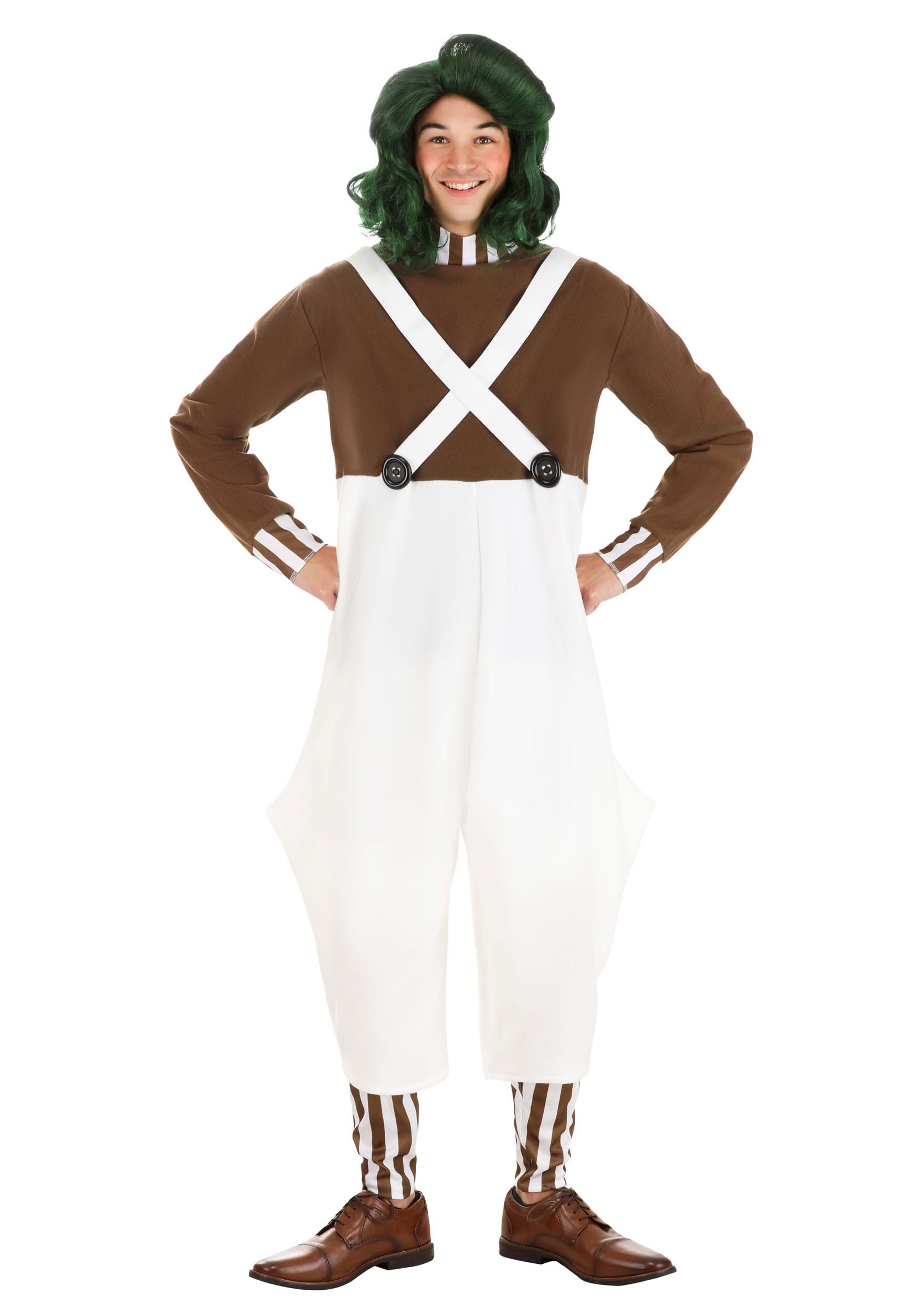 Help your boss guide unforgettable factory tours in this officially licensed, exclusive Willy Wonka Oompa Loompa Costume for Adults! The polyester jumpsuit fastens down the back and is designed to look like a chocolate-brown top beneath a pair of white overalls. The included brown and white leg warmers have elastic bands to keep them snugly in place, and their stripes match the trim that decorates the neckline and sleeve cuffs.