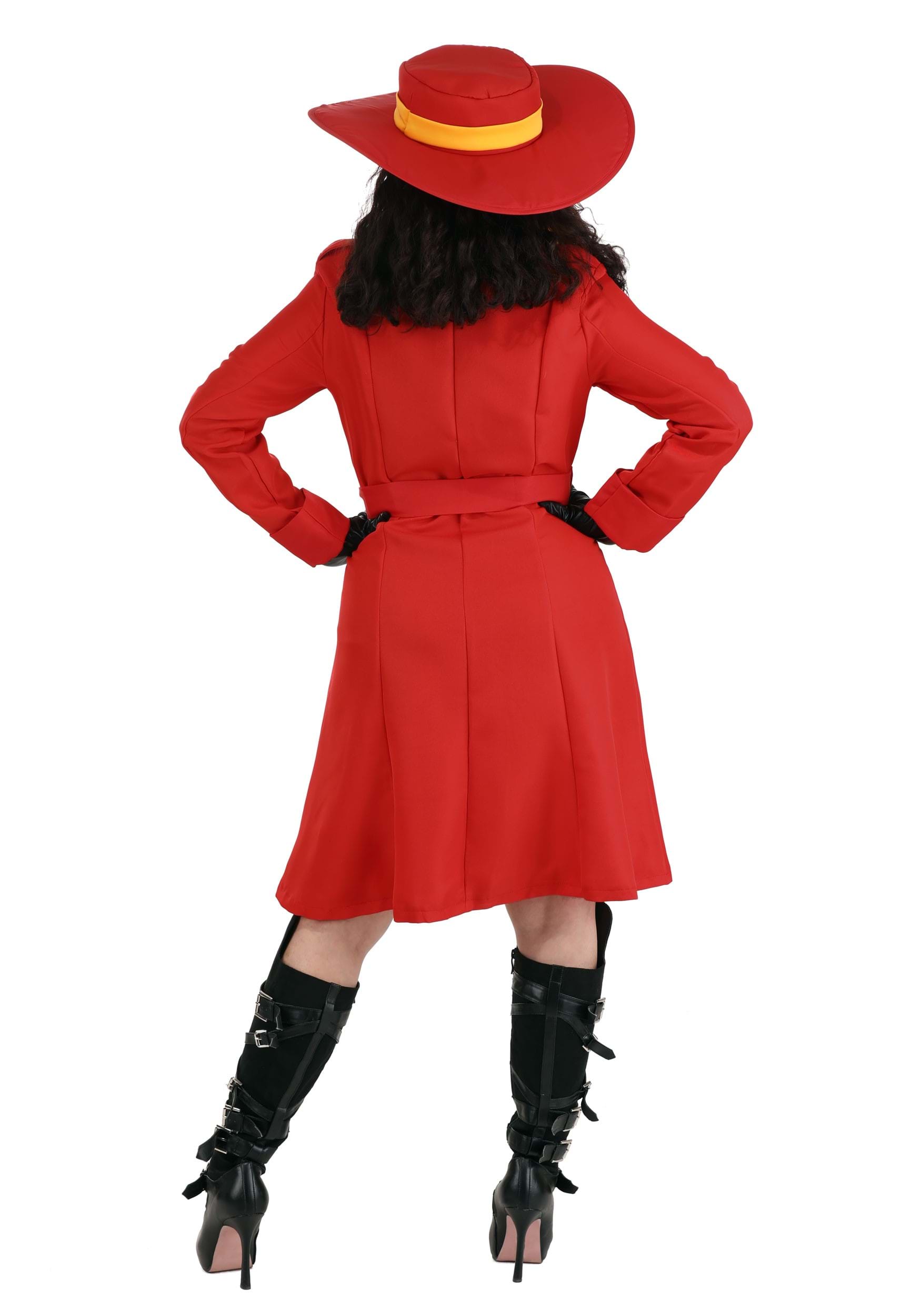 This officially licensed Carmen Sandiego costume will have you ready to craft a master plan to outwit every agent at ACME! You'll look the part perfectly with this knee-length world traveler coat that features gold buttons, shoulder straps at the shoulders, and a large collar to match the trench coat closure. The matching hat is a dark red fedora with a gold-finished band that matches perfectly with the long, jersey scarf.